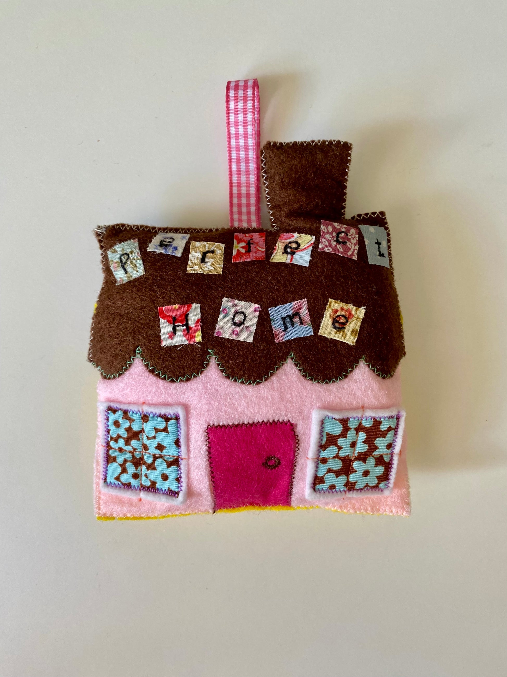 Felt houses with welcoming words for decoration. Made from felt and mix fabrics sewn together with stuffing.