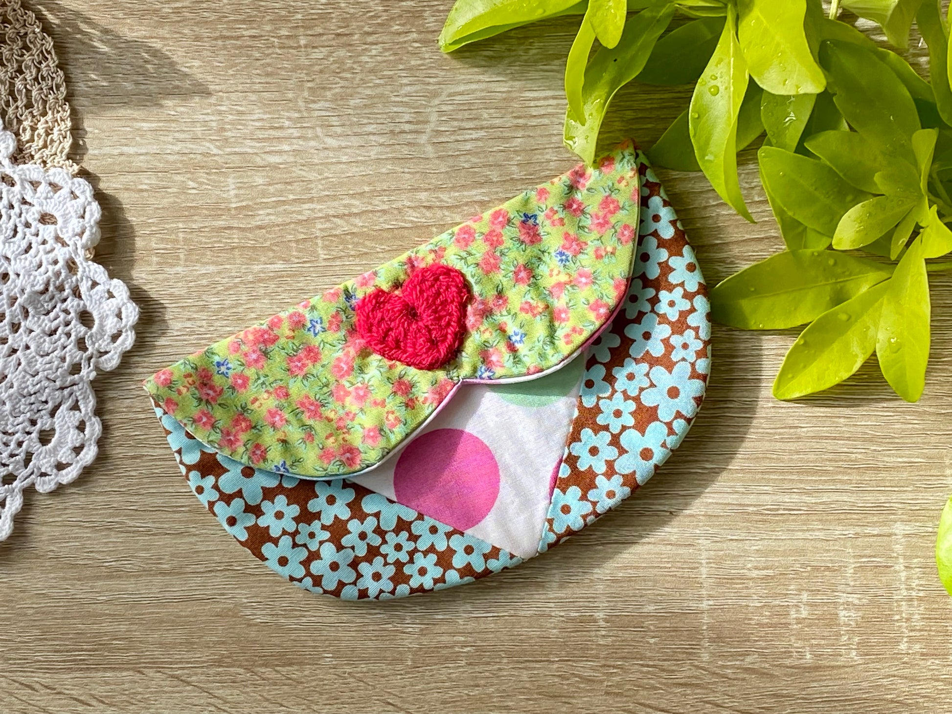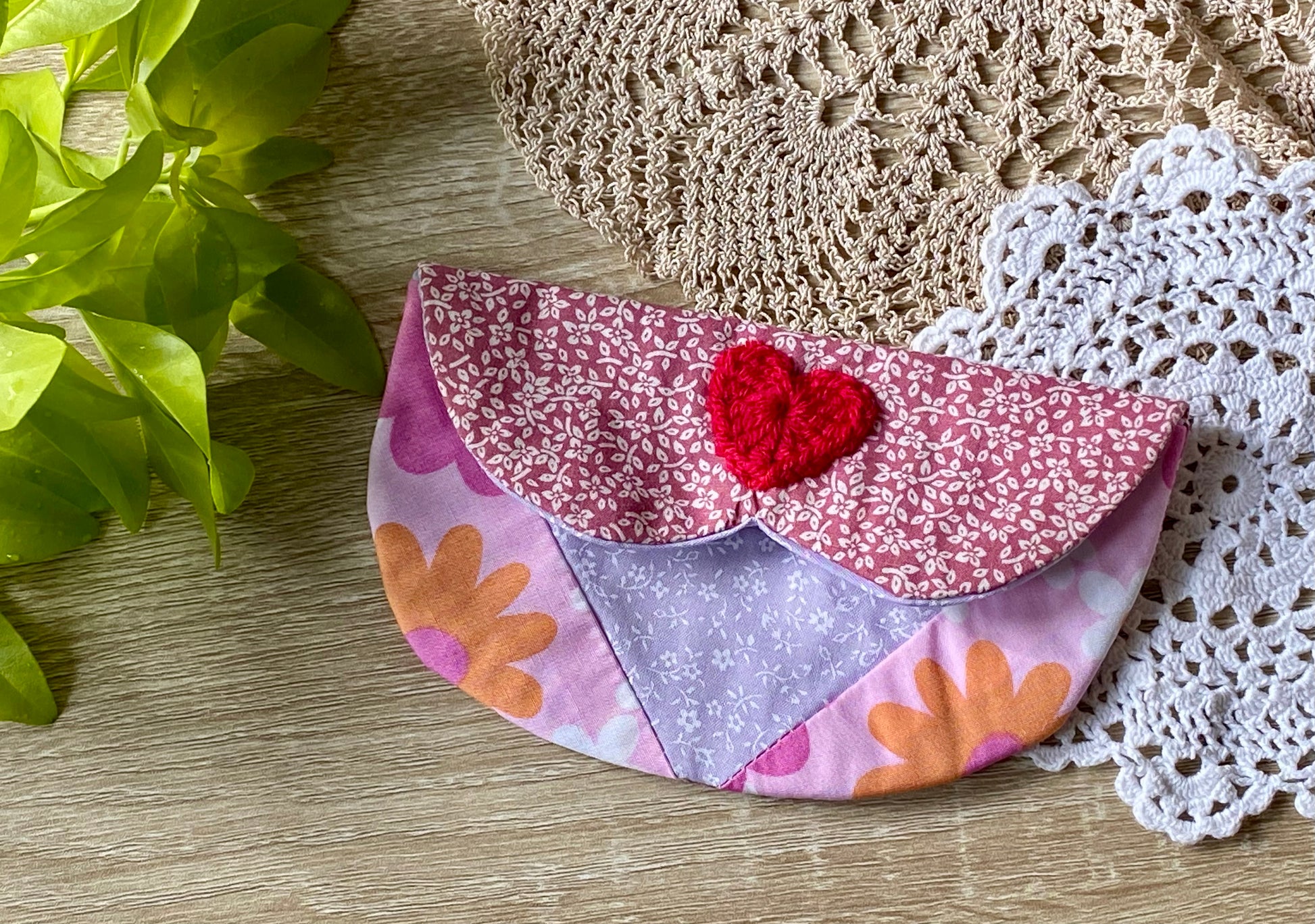 Aren’t these pouches adorable? It opens up to reveal a heart in the middle and there is a crochet heart on the front. Perfect for storing small accessories and make up. These were inspired by quilting where you sew different colour fabrics together.